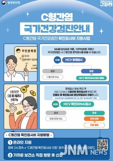 질병관리청은 2026년부터 56세(1970년생)를 대상으로 국가건강검진에서 C형간염 항체 양성 판정을 받은 경우, 확진 검사비 지원 의료기관을 기존 병·의원급에서 상급·종합병원까지 포함한 모든 의료기관으로 확대한다. 지원 항목은 진찰료와 검사비 본인부담금이다. 1회 최대 7만 원을 지원한다.