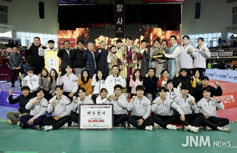 제이앤엠뉴스 | 영암군민속씨름단 김민재 장사가 18일 충남 태안종합실내체육관에서 열린 ‘2026 위더스제약 태안설날장사씨름대회’ 140kg 이하 백두급에서 우승하며 설날장사 타이틀을 거머쥐었다.