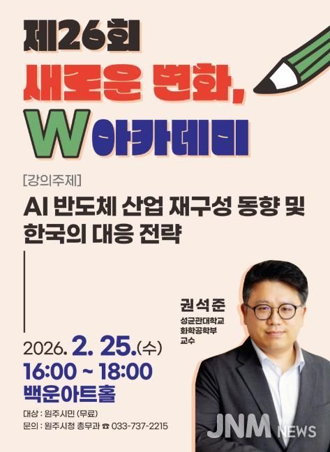 제이앤엠뉴스 | 원주시는 오는 25일 오후 4시 백운아트홀에서 ‘제26회 새로운 변화, W아카데미’를 개최한다.