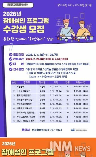 제이앤엠뉴스 | 원주교육문화관은 2월 26일부터 3월 10일까지 관내 장애성인을 대상으로 프로그램 수강생을 모집한다.