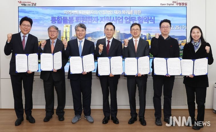 제이앤엠뉴스 | 꿈이 모이는 도시, 미래를 그리는 강남구가 퇴원 이후 돌봄 공백을 줄이고 지역사회 중심의 돌봄 체계를 강화하기 위해 2월 25일 구청에서 관내 6개 의료기관과 '통합돌봄 퇴원환자 지원사업' 추진을 위한 업무협약(MOU)을 체결했다. 협약 기관은 삼성서울병원, 연세대학교의과대학 강남세브란스병원, 강남베드로병원, 나누리병원, 메드렉스병원, 강남구립행복요양병원이다.