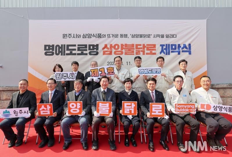 제이앤엠뉴스 | 원주시는 우산동 삼양식품 원주공장 인근에서 제1호 명예도로명 '삼양불닭로' 제막 행사를 지난 11일 개최했다.
