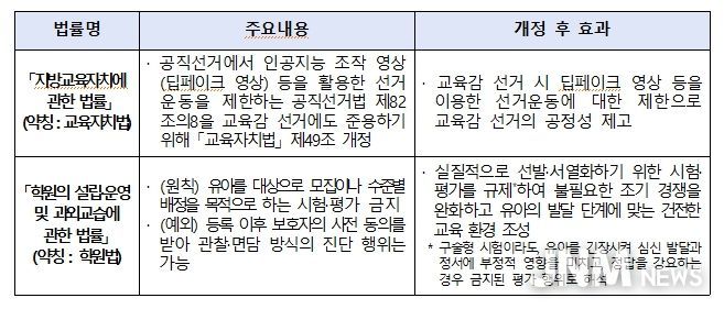 이번에 의결된 법률안은 교육감 선거의 공정성 강화와 유아 사교육비 부담 완화에 초점을 맞췄다. 지방교육자치에 관한 법률 개정으로, 앞으로 교육감 선거에서도 인공지능 조작 영상(딥페이크 영상) 등 허위 정보 활용을 제한하는 규정이 적용된다. 선거일 90일 전부터 선거일까지 딥페이크 영상을 제작·유포·게시하는 경우 형사처벌 대상이 되며, 선거운동 목적의 딥페이크 영상이 선거기간 외에 사용될 때도 가상 정보임을 명확히 표시하지 않으면 처벌받을 수 있다.