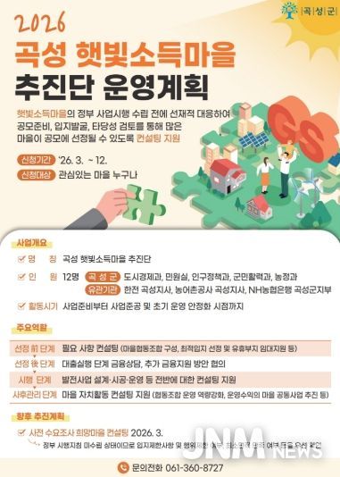 곡성군 관계자는 "햇빛소득마을 추진단을 중심으로 행정과 유관기관이 협력해 마을별 맞춤형 지원체계를 구축해 나가겠다"라며 "사전 컨설팅을 통해 사업 추진 가능성을 꼼꼼히 검토하고 더 많은 마을이 공모사업에 참여할 수 있도록 적극 지원하겠다"라고 밝혔다.