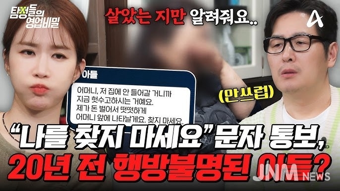 한편, 이날 방송에서는 20년 전 행방불명된 아들의 생사를 확인하고 싶다는 어머니의 간절한 요청도 소개됐다. 과거 남편의 도박 빚을 대신 떠안고 아들을 키운 어머니는, 아들이 스무 살이 되던 해 쪽지 한 장 없이 집을 떠난 뒤 행방을 알 수 없었다. 실종 1년 후 아들은 "집에 안 들어갈 거니까 찾지 말라"는 문자만 남겼고, 심부름센터에서도 "생활 반응이 전혀 없다"는 답변만 들었다. 마지막으로 확인된 주소지는 고시원이었으나 이미 거주불명 상태였다.