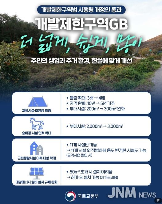 제이앤엠뉴스 | 개발제한구역(GB) 관련 규제가 대폭 완화되면서 주민들의 생업과 주거 환경에 맞춘 다양한 제도 개선이 이루어졌다.