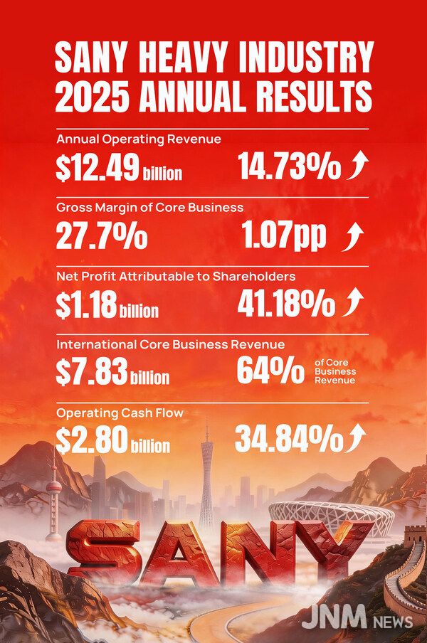 베이징, 2026년 4월 9일 -- 산이 중공업(SANY Heavy Industry)(600031.SH, 06031.HK)이 2025년 재무 실적을 발표했다. 매출은 전년 대비 14.73% 증가한 124억 9000만 달러를 기록했다. 주주 귀속 순이익은 41.18% 상승한 11억 8000만 달러를 달성했다. 영업 활동으로 인한 순 현금 창출액은 전년 대비 34.84% 증가한 28억 달러를 기록했다.