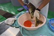 제이앤엠뉴스 | 경상북도 민물고기연구센터는 11월 1일 산란을 위해 울진 왕피천으로 돌아오는 어미연어 첫 포획이 시작되어 본격적인 종자생산 작업에 들어갔다. 이번에 포획된 어미연어는 13마리(암컷 6, 수컷 7), 전장 70㎝급으로, 이곳에서 3~4년 전 방류된 어린 연어가 북태평양을 회유하며 성장한 뒤 왕피천으로 돌아온 개체다. 연구센터는 왕피천 하류에 길이 250m 포획장을 설치해 어미연어를 포획, 채란, 종자를 생산해 내년 봄 60만 마리의 치어를 왕피천에 방류한다. 올해는 10월 지속적인 강수로 인해 포획장 설치 지연으로 첫 포획이 다소 늦어졌으나, 지금부터 주 산란 시기로 목표량 달성에 최선을 다할 예정이다. 아울러 수산 계열 고등학생을 대상으로 채란, 수정, 부화 등 인공부화 전 과정을 체험할 수 있는 현장학습 프로그램도 운영한다. 연어 방류 사업은 하천 개발 등으로 산란장이 훼손되어 연어의 자연 산란이 어려워짐에 따라 경북도에서 1970년부터 이어온 사업으로, 인공부화를 통한 치어방류로 도내에 연어가 회귀하는 하천을 계속 보존하기 위한 중요한 사업이다. 한편,