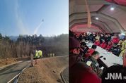 제이앤엠뉴스 | 서산 대산읍에서 발생한 산불이 한국석유공사 비축기지와 인접 석유화학단지를 위협하는 긴박한 상황으로 번졌으나, 소방과 유관기관의 신속하고 집중적인 방어작전으로 국가 핵심 에너지 시설을 지켜냈다. 서산소방서에 따르면 화재는 2월 21일 오후 1시 35분경 대산읍 대죽리 일대에서 발생했다. 현장은 강풍과 건조한 기상 여건 속에 불길이 빠르게 확산되며 석유화학단지 방향으로 번졌고, 특히 한국석유공사 비축기지 인근 산림까지 화선이 형성되면서 국가 에너지 기반시설에 대한 직접적 위협이 현실화됐다. 이에 소방은 단순 진화가 아닌 ‘시설 사수’에 초점을 맞춘 전략적 대응에 돌입하여 대응2단계를 발령했으며, 화세를 차단하기 위한 방어선 구축과 함께 비축기지 주변 집중 살수, 헬기 공중진화, 지상 인력 분산 배치 등 입체적 작전을 전개했다. 한국석유공사와 롯데케미칼, 현대오일뱅크, LG화학, KCC 등 주요 산업체와의 공조도 신속히 이뤄졌다. 이틀간 1,050명의 인력과 장비 130대, 최대 24대의 헬기가 투입됐으며, 유관기관 공동대응으로 전면적인 방어체계가 운영됐다. 일몰 이후 지상 방어 중심으로