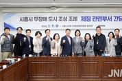 제이앤엠뉴스 | 경기 시흥시의회는 지난 11일 의회운영위원회 회의장에서 '시흥시 무장애 도시 조성 조례' (대표발의: 김수연 의원) 제정을 위한 간담회를 개최했다. 이번 간담회는 장애인, 고령자, 임산부 등 모든 시민이 물리적·심리적 장벽 없이 안전하고 편리하게 생활할 수 있는 도시 환경을 구축하기 위해 마련됐다. 이번 간담회에는 조례안을 발의한 의원들과 관계 공무원 등 총 20명이 참여하여, 무장애 도시 조성을 위한 제도적 방향과 실질적인 이행 방안을 집중적으로 논의했다. 조례안의 주요 내용은 ▲무장애 도시 조성의 법적 기반 마련 및 추진위원회 구성 ▲무장애 시설 점검 및 평가를 위한 모니터링 체계 구축 ▲ 참여 기관 등에 대한 재정지원 및 인센티브 부여 등이 있다. 참석자들은 국내·외 우수 사례와 시흥시의 현장 실태를 공유하며, 무장애 도시 조성에 대한 근거와 실효성을 확보하는 데 깊은 공감대를 형성했다. 특히 시흥시의회는 정책의 실효성을 높이기 위해 복지·도시정책·교통 등 관계 부서 간의 유기적인 협력을 주문했다. 현장의 애로사항과 민원을 적극 반영한 시범사업을 추진하여 시행착오를 줄이고 완성