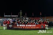 제이앤엠뉴스 | 김천상무가 지난 시즌에 이어 3위로 2025시즌을 마무리했다. 김천상무프로축구단(대표이사 이재하)이 11월 30일 토요일 16시 30분, 김천종합운동장에서 열린 ‘하나은행 K리그1 2025’ 38R에서 대전하나시티즌(이하 대전)에 0대 3으로 패하며 2025시즌 K리그1 3위를 기록했다. 김천상무는 2024시즌에 이어 상위권 성적을 올리며 내년을 더욱 기대하게 했다. 특히 정정용 감독도 “내년은 시민구단 전환에 중요한 해”라며 감독으로서의 노력을 다짐했다. 김천상무는 4-4-2 포메이션을 가동했다. 골키퍼 장갑은 문현호가 꼈다. 백포는 박철우, 김민규, 이정택, 김태환이 구축했다. 중원은 박태준과 이수빈이 구성했다. 양쪽 날개에 김주찬과 고재현이 포진했고, 이건희와 박세진이 최전방에 포진했다. 실수로 인한 아쉬운 선제 실점 전반 0대 1 종료 김천상무는 2025시즌 한 해 동안 힘찬 응원을 보낸 팬들에게 감사의 마음을 담은 ‘Thanks Day’ 이벤트로 관중을 맞이했다. 홈팬들도 2위 탈환을 위해 힘찬 응원으로 선수들과 함께 호흡하며 경기를 시작했다. 경기 초반을 주도한 팀은 김천