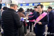제이앤엠뉴스 | 진주시는 지난 13일 진주역에서 설 명절 연휴를 맞아 귀성·귀경객들에게 새해 인사를 전하고, 지역의 대표 농산물인 ‘진주쌀’ 홍보 활동을 펼쳤다. 이날 조규일 진주시장을 비롯한 시 관계자들은 진주역을 찾은 시민과 방문객들에게 일일이 인사를 건네며 안전한 귀성길과 새해 건강을 기원하는 덕담을 전했다. 귀성객들은 따뜻한 환영 인사에 화답하며 역사 내에는 훈훈한 설 명절 분위기가 이어졌다. 이번 행사에는 농협 진주시지부와 고향을 사랑하는 주부모임 회원들도 함께 참여해 진주시 대표 농산물인 ‘온새미로 쌀’ 홍보 활동을 펼쳤다. 귀성객들에게 홍보물을 나눠주며 지역 쌀 소비 활성화를 위한 관심과 참여를 당부했다. ‘온새미로 쌀’은 진주시 농특산물 공동브랜드 ‘진주드림’의 핵심 품목으로, 진주시가 운영하는 ‘진주드림 쇼핑몰’의 인기 상품이다. 특히 오메가-3를 함유한 기능성 쌀로, 친환경적인 농법을 통해 생산돼 우수한 품질을 인정받고 있다. 또한 한국여성농업인연합회 회원들과 함께 귀성·귀경객들을 대상으로‘설맞이 고향사랑기부제 특별 이벤트’ 홍보 활동도 진행했다. 고향사랑기부제의 취지와 참여 방법