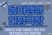제이앤엠뉴스 | 양주희망도서관이 오는 13일 도서관 내 희망극장에서 국악 사물놀이를 기반으로 한 인형극 '음마깽깽 인형극장'을 운영한다. '음마깽깽 인형극장'은 연말을 맞아 한 해를 마무리 할 수 있는 주제로 ‘수고했어, 올해도’로 기획됐다. 지난달 29일 약 80여 명의 관객과 함께한 천 개의 캔들 음악회에 이은 두 번째 시간이다. 특히 이번 공연은 경기아트센터의 “찾아가는 문화복지공연” 사업으로 지역 시민들에게 수준 높은 문화예술 향유의 기회를 제공하고자 마련됐다. 본 공연을 펼쳐 줄 ‘음마깽깽 연희극장’팀은 국가중요무형문화재로 지정된 전통 인형극인 ‘덜미’를 중심으로 국악과 인형극을 접목하여, 국내 유일한 남사당놀이 극을 진행하는 팀이다. 이번 공연은 3가지 막으로 구성된 옴니버스 형식의 인형극으로 펼쳐진다. 관람 신청은 도서관 누리집에서 선착순으로 가능하며, 양주시민이면 누구나 무료로 관람할 수 있다. 도서관 관계자는 “연말을 맞아 도서관에서 함께하는 공연을 통해 올해 고생한 서로를 위로하며 한 해를 잘 마무리하는 시간이 되길 기대한다”고 전했다. [뉴스출처 : 경기도 양주시]
