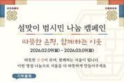 제이앤엠뉴스 | 서울시는 3월 9일까지 서울잇다푸드뱅크센터와 함께 '2026년 설맞이 범시민 나눔 캠페인'을 추진한다. 이번 캠페인은 개인, 기업, 기관의 자발적인 식품 및 생활용품 기부로 진행되며, 시는 이를 통해 취약계층이 소외되지 않는 따뜻한 겨울을 보내고 지역사회 전반에 나눔문화가 확산되길 기대하고 있다. 기부 가능한 품목은 통조림, 캔음료, 라면, 쌀 등 장기간 보관이 가능한 식품과 생활용품(의류, 휴지, 치약 등)이며, 소비기한이 임박한 식품은 기부가 제한된다. 신선·냉장·냉동식품의 경우 자치구 잇다푸드뱅크 문의를 통해 기부 가능 여부를 사전 확인해야 한다. 해당 캠페인은 매년 설과 추석 명절에 추진되는 범시민 참여형 나눔 행사로, 지난해에는 총 16억 4천만 원 상당의 기부금과 현물의 온정이 모였으며, 서울시 취약계층 25,078가구에 전달됐다. 캠페인 참여를 원하는 경우 구청, 동주민센터, 아파트, 교회 등 자치구별 거점기관에 설치된 기부박스에 식품과 생활용품 등의 현물을 기부할 수 있으며, 기부박스 설치 위치 등 세부 참여 장소는 서울잇다푸드뱅크 누리집 ‘참여하기-캠페인후원’에서 확인할 수 있다