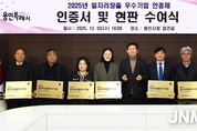 제이앤엠뉴스 | 용인특례시는 3일 본관 4층 전겹실에서 일자리 창출에 힘쓴 지역 우수기업 8곳에 인증서와 현판을 수여했다. 이번에 선정된 기업은 ▲아산디앤씨 주식회사 ▲일승푸드 제2공장 ▲주식회사 에이치에스씨 ▲㈜인실리코젠 ▲주식회사 홈체크 ▲㈜휴먼인텍 ▲케이제이건설산업(주) ▲트루션 등 총 8개사다. 시는 1차 서류심사와 2차 현장실사를 거쳐 일자리 창출 실적, 고용 안정성, 기업의 성장 가능성, 근로환경 등을 종합적으로 평가해 우수기업을 선정했다. 이들 기업은 최근 1년간 총 74명(기업당 4~19명)을 신규 채용해 지역 내 일자리 창출에 기여했다. 또, 다양한 직원복지제도로 근무하기 좋은 환경을 조성해 일자리의 질을 높이는 데 크게 힘쓴 것으로 평가됐다. 이들 기업에는 인증서와 현판이 수여되며, 시가 주최하는 일자리사업, 기업지원사업 참여 시 가점이 주어진다. 일자리박람회 등 채용 행사에도 우선적으로 참여할 수 있다. 용인특례시 일자리창출 우수기업 인증제는 2018년부터 시행되고 있으며, 매년 고용 확대와 일자리 창출에 기여한 기업을 발굴·지원하고 있다.