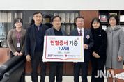 제이앤엠뉴스 | 사내 헌혈 캠페인 및 자발적 기증을 통해 모은 헌혈증서 107장 경남혈액원에 전달 (재)김해문화관광재단(대표 최석철)은 지난 2월 11일, 지역사회의 혈액 수급 안정과 생명 나눔 문화 확산을 위해 임직원들이 자발적으로 모은 헌혈증서 107장을 대한적십자사 경남혈액원에 전달했다고 밝혔다. 재단은 지난 1월 26일 진행된 「사랑의 헌혈」 행사와 그간 진행해 온 상시 기부 캠페인을 통해 총 107장의 헌혈증서를 모았다. 이는 당초 목표했던 100장을 초과 달성한 수치로, 사내 헌혈 행사를 통해 모인 증서와 임직원들이 개인적으로 소지하고 있던 증서를 자발적으로 전달하며 총 107장이라는 뜻깊은 숫자를 기록했다. 전달식은 김해문화의전당에서, 김해문화관광재단 최석철 대표이사와 대한적십자사 경남혈액원 이정우 원장 등이 참석한 가운데 진행됐다. 기부된 헌혈증서는 향후 지역 내 수혈이 필요한 환우 및 긴급 혈액 수급 상황 등에 소중하게 사용될 예정이다. 김해문화관광재단 김봉조 경영기획본부장은 “임직원들의 적극적인 참여 덕분에 100장이 넘는 소중한 마음을 모을 수 있었다”고 밝혔다. &