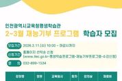 제이앤엠뉴스 | 인천광역시교육청평생학습관은 오는 23일부터 ‘재능기부 프로그램’을 운영한다. 이번 프로그램은 시민이 강사로 참여해 자신의 전문성과 경험을 공유하는 참여형 평생학습 활동으로, 매월 새로운 주제의 강좌를 통해 생활 속 배움의 기회를 제공한다. 2월부터 운영되는 강좌는 ‘시니어 요가’, ‘시니어 필라테스’, ‘근력 스트레칭’, ‘나를 닮은 꽃그림’, ‘내 마음속의 논어’ 등 총 5가지이다. 수강 신청은 11일 오전 10시부터 평생학습관 누리집에서 선착순으로 진행되며, 자세한 사항은 누리집의 공지사항을 확인하거나 평생교육부로 문의하면 된다. [뉴스출처 : 인천시교육청]