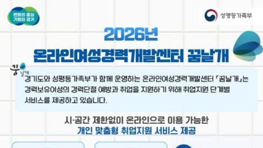 제이앤엠뉴스 | 경기도가 경력보유여성 등 미취업여성의 경력단절을 예방하고 경제활동 참여를 지원하기 위해 ‘온라인 여성경력개발센터(꿈날개)’ 사업을 추진한다. 온라인 여성경력개발센터(꿈날개)는 국비사업으로, 시간과 장소의 제약 없이 이용할 수 있는 원스톱 취업지원 플랫폼이다. 온라인에서 취업진단·교육·상담 등 개인별 맞춤형 경력개발 서비스를 제공한다. 특히 올해는 AI 자가진단서비스를 새롭게 도입하고, 취업 가능성, 직업역량, 직업 선호도, 적성검사 등 맞춤형 진단을 운영한다. 이를 통해 이용자별 진단 결과에 따른 경력개발계획을 수립하고, 필요한 교육과정을 추천해 체계적인 취업 준비를 지원한다. 또한 취업에 필요한 1,400여 개 직무 필수 교육과정을 운영하며, 개인 경력과 상황을 반영한 맞춤 진로상담과 전문 컨설턴트 코칭, 직장적응 등 상담서비스를 제공한다. 아울러 매년 이용 만족도가 높은 이력서 클리닉, 화상 모의면접 등 실전형 지원도 함께 추진한다. 이용을 원하는 취업희망 여성은 온라인 여성경력개발센터 꿈날개에 접속하면 원스톱 취업지원 서비스를 이용할 수 있다. 권정현 고용평등과장은