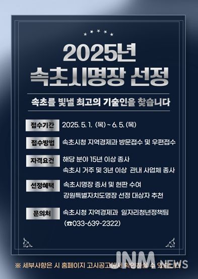 제이앤엠뉴스 | 속초시가 지역산업의 역량 강화와 지역경제 활성화를 위해 5월 1일부터 6월 5일까지 관내 최고 수준의 숙련기술자를 대상으로 속초시명장을 모집한다.