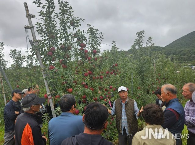 이번 견학은 곡성군 사과 재배농업인 30명이 참석한 가운데, 사과 다축 재배 기술과 과원 관리 기법을 현장에서 직접 보고 배우는 실질적인 교육의 장으로 마련됐다.