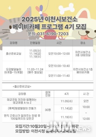 제이앤엠뉴스 | 이천시는 임산부 및 6개월~15개월 영아의 보호자를 대상으로 10월 20일부터 ‘베이비카페 프로그램 4기’ 대상자를 선착순으로 모집 중이다. 온라인 신청(이천시청 누리집-교육포털-교육 강좌 신청)을 통해 선착순으로 접수하며 오감 발달 놀이의 경우 각 12명씩을 모집한다.