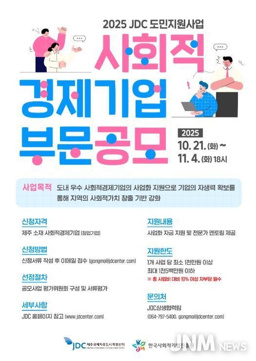 제이앤엠뉴스 | 제주국제자유도시개발센터는 제주 지역의 사회적가치 창출 기반 강화를 위한 ‘2025년 도민지원사업 사회적경제기업 부문 공모’를 오는 11월 4일까지 실시한다고 밝혔다.