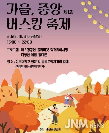 제이앤엠뉴스 | 청주대중앙로상인연합회(회장 안재룡)는 오는 31일 오후 3시부터 10시까지 청주대 중앙로 먹자거리(파리바게트~왕뚝배기 한 블록)에서 ‘제1회 가을중앙버스킹축제’를 개최한다고 밝혔다.
