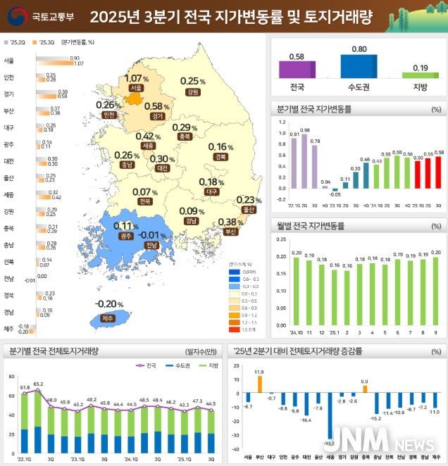 제이앤엠뉴스 | 국토교통부와 한국부동산원(원장 손태락)은 '25년 3분기 지가변동률 및 토지거래량을 발표했다.