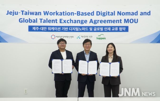 제이앤엠뉴스 | 제주창조경제혁신센터(대표이사 이병선, 이하 제주센터)는 오늘(24일) 대만 국가발전위원회 노마드 타이완 오피스(대표 Kai Hsu, 이하 노마드 타이완), 그리고 호퍼스(대표 조정현)와 함께 제주-대만 워케이션 기반 디지털노마드 및 글로벌 인재 교류 협약을 체결했다.