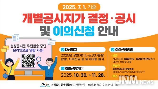 제이앤엠뉴스 | 서귀포시는 2025년 7월 1일 기준 개별공시지가를 오는 10월 30일에 결정·공시한다. 또한 10월 30일부터 11월 28일까지 30일간 이의신청 기간을 운영하여 시민들의 의견을 적극적으로 수렴할 계획이다.