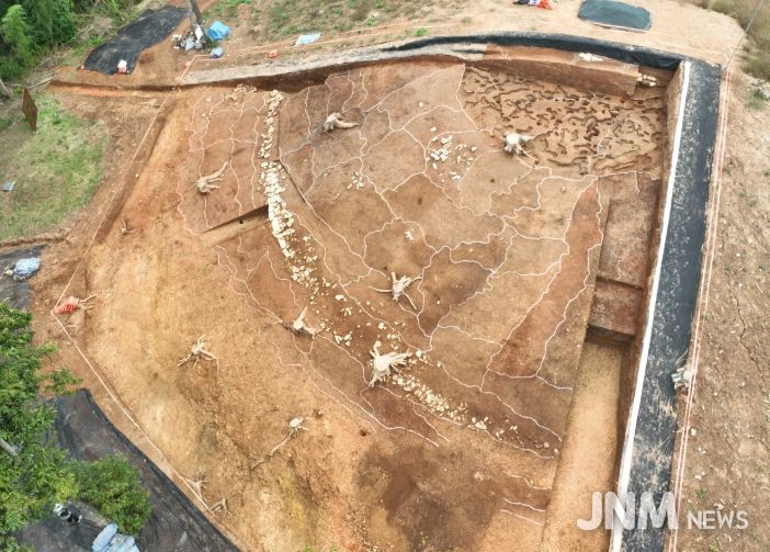 제이앤엠뉴스 | 경상남도는 31일 고성읍 기월리 일원에서 진행 중인 고성 송학동 고분군 14호분 2차 발굴조사 결과, 가야권역 내 최대 규모의 봉분 구조와 정교한 축조공정이 새롭게 밝혀졌다고 밝혔다.