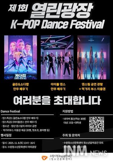 제이앤엠뉴스 | 수원시청소년청년재단 청소년문화센터는 2025년 11월 8일 야외광장에서 청소년·청년이 함께 즐기는 가을 문화행사 열린광장 '청소년·청년 댄스 페스티벌'을 개최한다.