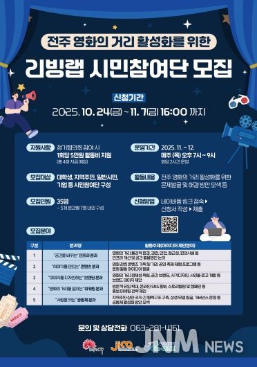 제이앤엠뉴스 | 전주정보문화산업진흥원(원장 허전)과 우석대학교(총장 박노준)는 전북 RISE 1차 공모사업의 일환으로 ‘전주 영화의 거리 활성화를 위한 리빙랩’의 시민참여단을 모집한다고 밝혔다.