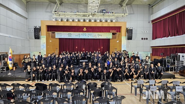 제이앤엠뉴스 | 세종특별자치시교육청은 11월 4일에 금호중학교 다목적강당에서 금호중학교(교장 강승연, 이하 금호중)의 ‘금호윈드오케스트라’(지도교사 조현영, 지휘자 연춘흠)와 연서중학교(교장 유효종)의 ‘연서오케스트라’(지도교사 이은정, 지휘자 김채연)가 함께 만드는 ‘2025 세종예술온(ON)학교’ 예술학교 ‘세종 학생 음악 나눔 축제’를 성황리에 마쳤다.