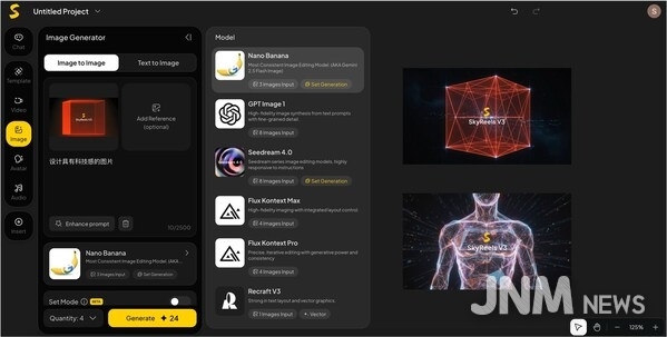 이번에 업그레이드된 스카이릴스에서는 모든 AI 기능과 세계 최고의 AI 모델이 단일 창작 작업 공간에 완벽하게 통합되었다. 하나의 캔버스가 통합형 AI 도구 역할을 하여 이미지, 동영상, 음악, 기타 멀티모달 콘텐츠를 손쉽게 병합할 수 있다.
