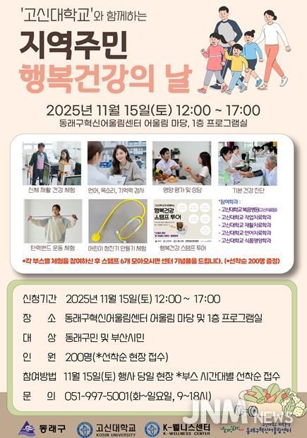 제이앤엠뉴스 | 부산 동래구는 오는 11월 15일 낮 12시부터 동래구 혁신어울림센터(동래구 금강로 129) 1층 어울림 마당에서 고신대학교와 함께 ‘지역 주민 행복 건강의 날’ 행사를 개최한다고 밝혔다.