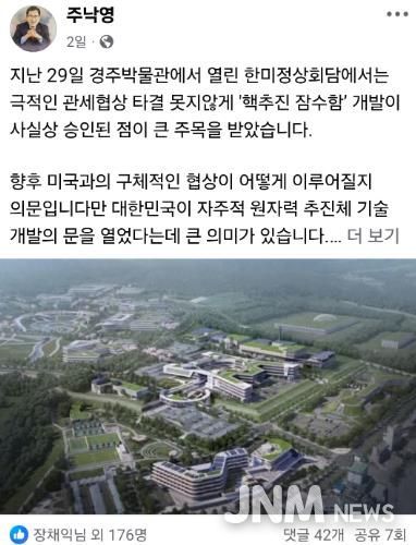 제이앤엠뉴스 | 주낙영 경주시장이 최근 자신의 사회관계망서비스(SNS)에 “감포에 건립 중인 문무대왕과학연구소가 향후 핵추진 잠수함 추진체 기술의 기반이 될 수 있다”고 게시했다.