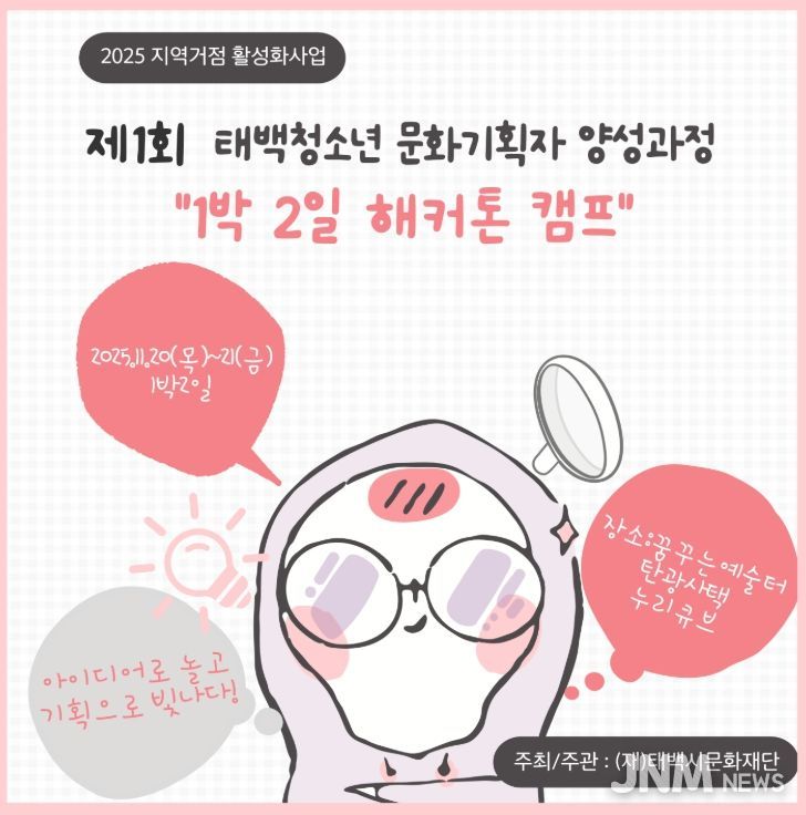 제이앤엠뉴스 | (재)태백시문화재단은 11월 20일)부터 21일까지 1박 2일간 태백 꿈꾸는 예술터(탄광사택 누리큐브)에서 '제1회 태백 청소년 문화기획자 양성과정 ‘1박 2일 해커톤 캠프’'를 운영한다.