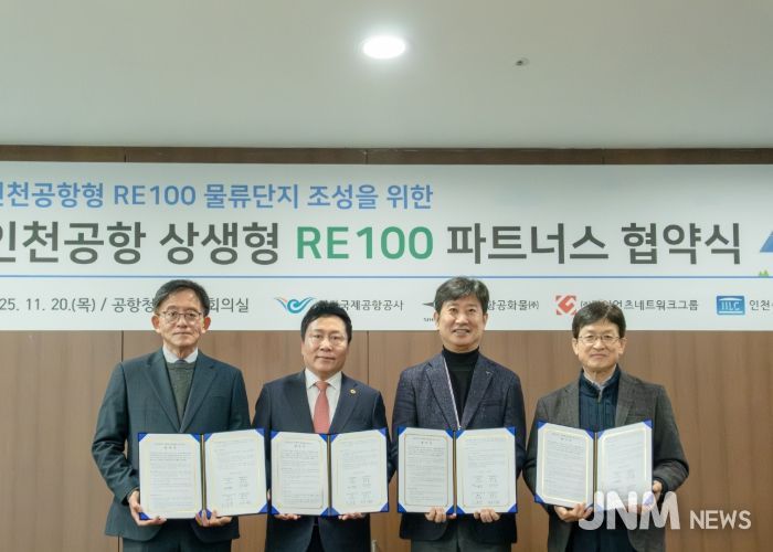 제이앤엠뉴스 | 인천국제공항공사는 20일 오전 공항청사 회의실에서 물류단지 입주기업 3개社와 함께 ‘상생형 RE100 파트너스 업무협약(MOU)’을 체결했다고 밝혔다.