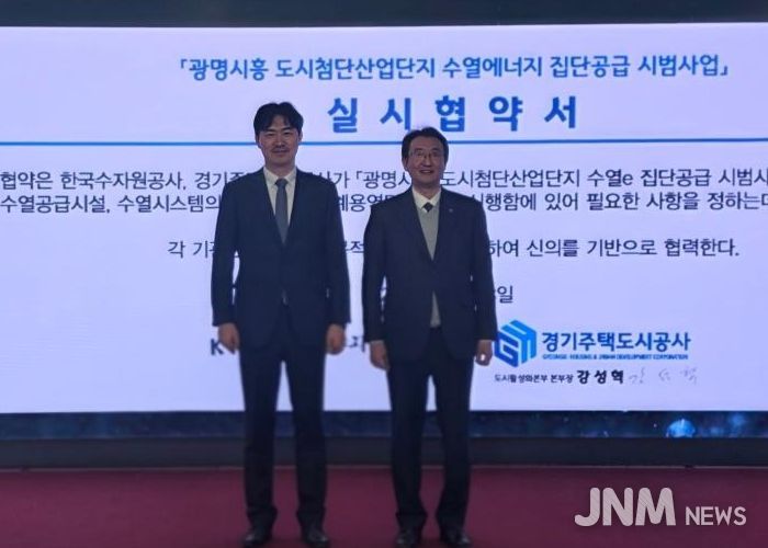 제이앤엠뉴스 | 경기주택도시공사(GH)는 3일 GH 수원 본사 9층 역량개발센터에서 한국수자원공사(K-water)와 함께 ‘광명시흥 도시첨단산업단지 수열에너지 집단공급 시범사업’ 추진을 위한 실시협약을 체결했다고 밝혔다. 이 자리에는 양 기관 관계자 약 30명이 참석했다.