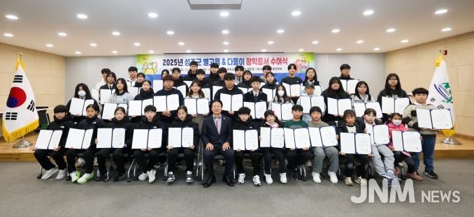 제이앤엠뉴스 | 성주군과 (재)성주군별고을장학회는 지난 12일 예체능 분야에서 뛰어난 성과를 거둔 학생들을 격려하고 저출생에 대응하여 출산을 장려하는 사회적 분위기를 확산시키고자 '2025년 성주군 별고을 & 다둥이 장학증서 수여식'을 동시 개최했다.