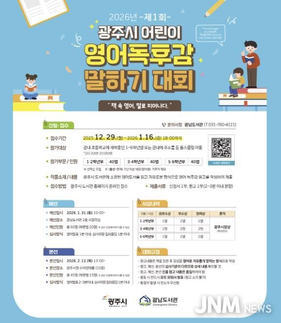 제이앤엠뉴스 | 광주시는 어린이들의 영어 독서 습관 형성과 영어 말하기 능력 향상을 위해 2026년 ‘제1회 광주시 어린이 영어 독후감 말하기 대회’를 개최한다고 19일 밝혔다.