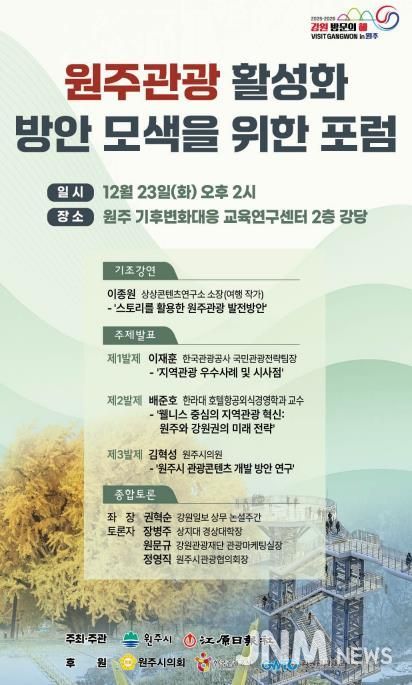 제이앤엠뉴스 | 원주시는 오는 23일 오후 2시, 기후변화대응교육연구센터 2층 대강당에서 ‘원주관광 활성화 방안 모색을 위한 포럼’을 개최한다.