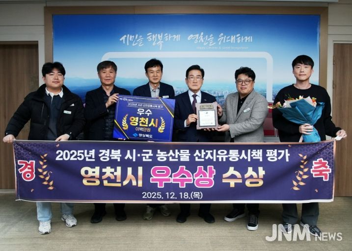 제이앤엠뉴스 | 영천시는 지난 18일 경주에서 열린 농산물 산지유통 총괄평가회에서 ‘2025년 경상북도 시·군 농산물 산지유통시책 평가’ 우수상을 수상했다고 밝혔다.