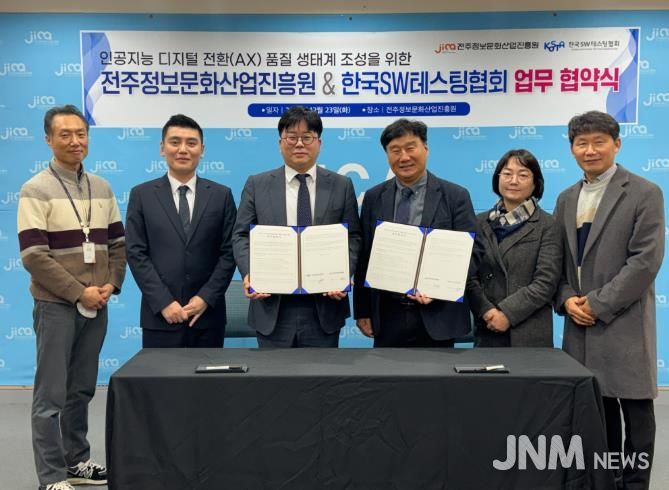 제이앤엠뉴스 | 전주시 출연기관인 (재)전주정보문화산업진흥원은 23일 진흥원 멀티미디어기술지원센터 1층 세미나실에서 사단법인 한국소프트웨어테스팅협회와 ‘인공지능 디지털 전환(AX) 품질 생태계 조성’을 위한 업무협약을 체결했다.