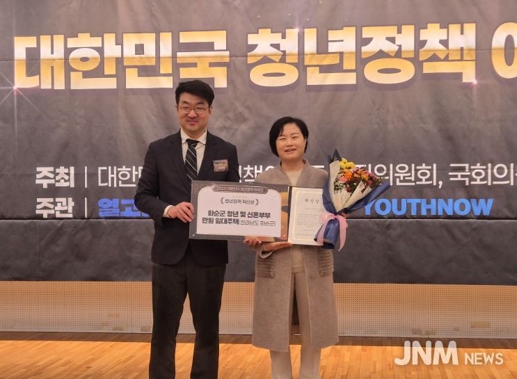 제이앤엠뉴스 | 화순군은 23일 국회도서관 대강당에서 열린 ‘2025 대한민국 청년정책 어워즈’에서 청년 및 신혼부부 만원임대주택 정책으로 ‘혁신상’을 수상했다고 밝혔다.