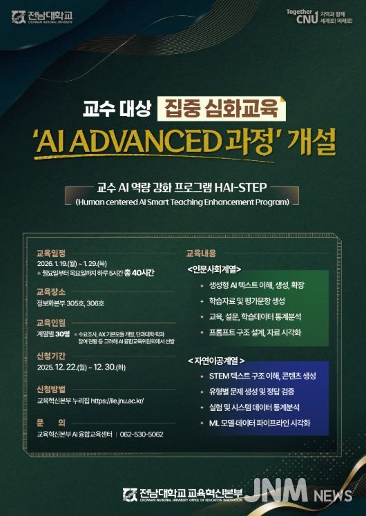 제이앤엠뉴스 | 전국 대학 최초로 AI 캠퍼스 대전환을 추진한 전남대학교가 교수들의 AI 활용 역량을 체계적으로 강화하기 위한 단계별 교육 프로그램을 본격 운영한다.