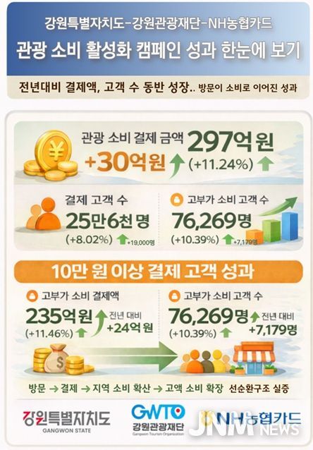 제이앤엠뉴스 | 강원특별자치도와 강원관광재단은 NH농협카드와 함께 추진한 ‘강원 관광소비 활성화 상생 캠페인’ 결과, 전년 동일 기간 대비 관광 소비 금액과 결제 고객 수가 모두 증가하며 실질적인 지역 소비 활성화 성과를 거둔 것으로 나타났다.