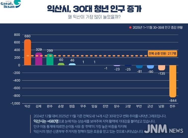 지난해 12월 대비 올해 11월 익산의 30대 인구는 680명 증가했다.