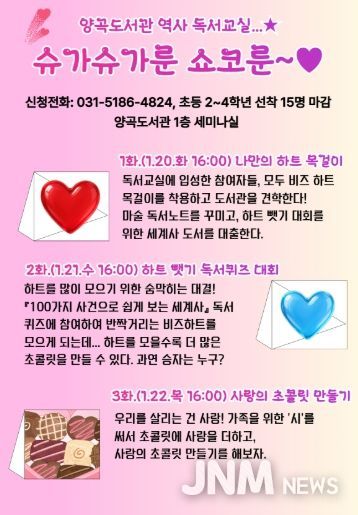 제이앤엠뉴스 | 김포시는 2026년 1월 20일 오후 4시부터 6시까지 1층 세미나실에서 초등학교 2~4학년을 대상으로 한 역사 독서교실 '슈가슈가룬 쇼코룬'을 운영한다.